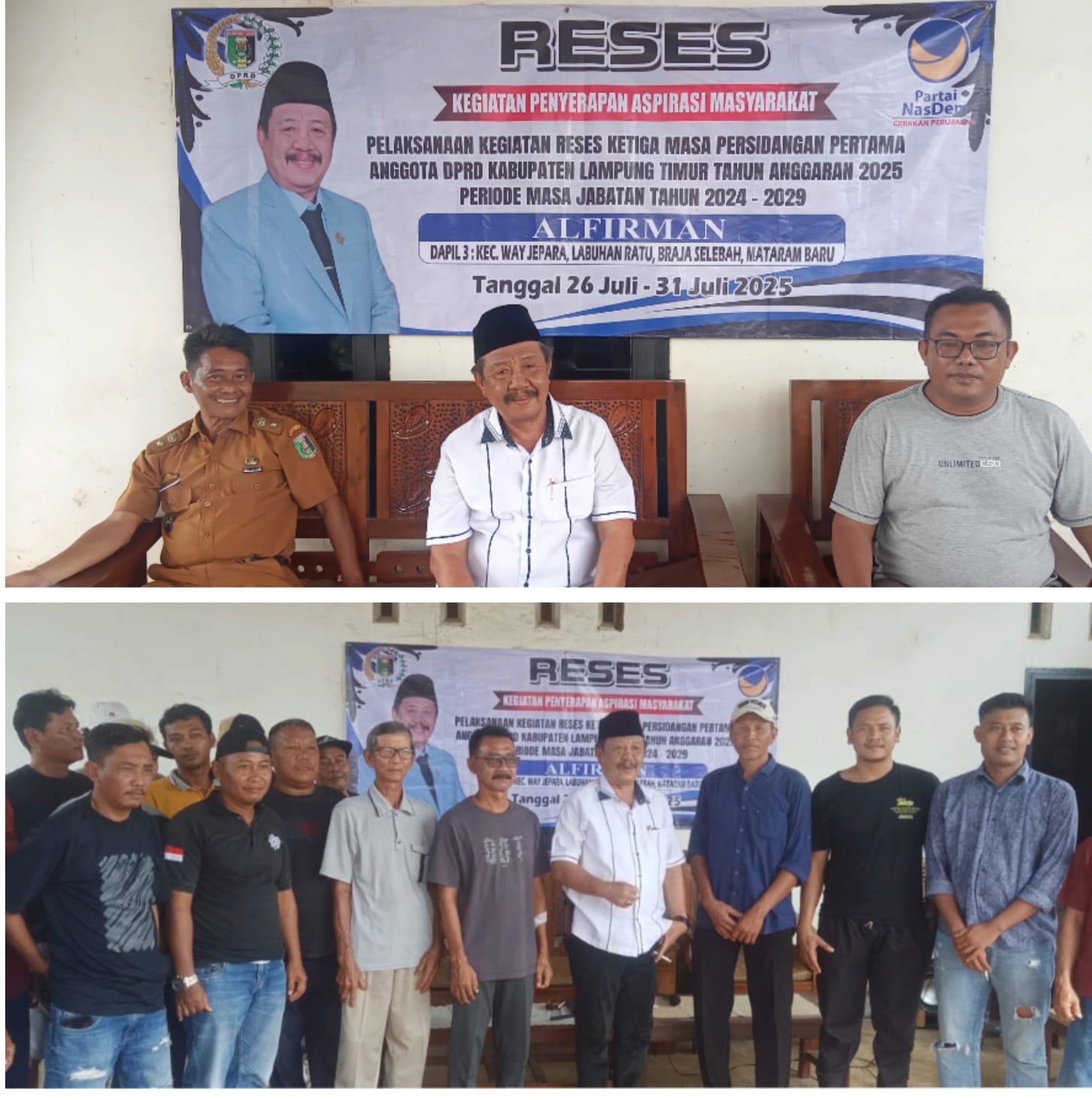 Nahkodanews.com | Mataram Baru, Lampung Timur – Anggota DPRD Lampung Timur dari Komisi I, Dapil 3 Partai NasDem, Alfirman, melaksanakan kegiatan reses ketiga masa persidangan pertama tahun anggaran 2025 pada hari ini, 31 Agustus 2025, di Dusun 2, Desa Mataram Baru, Kecamatan Mataram Baru.